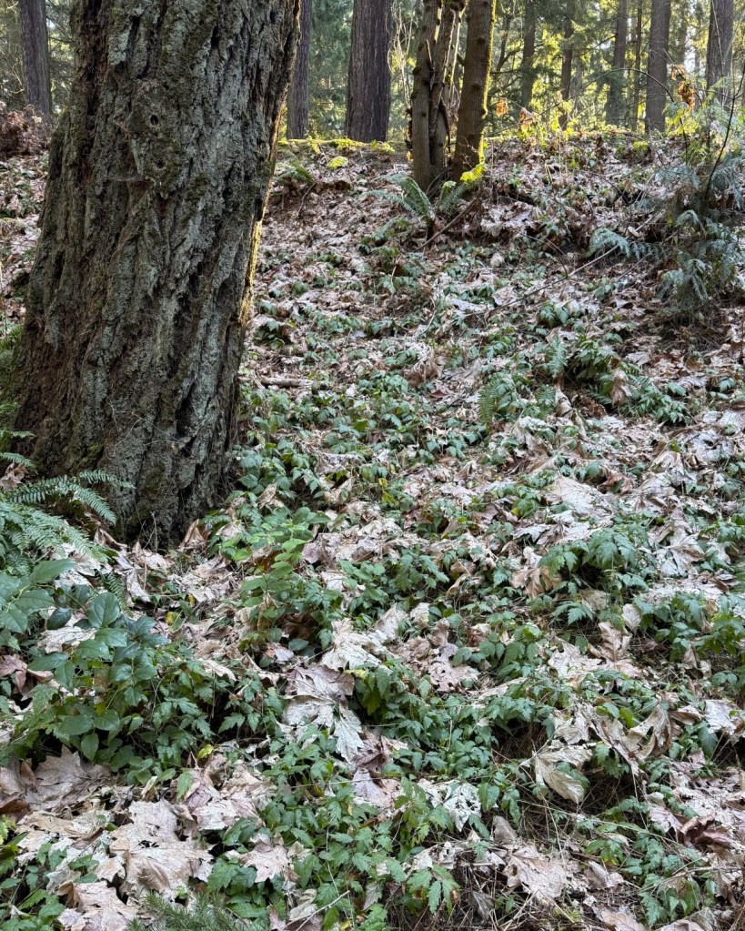 Between 2002 and 2018, the Rose City Bluff remained largely undisturbed, allowing humus to accumulate beneath the blackberry thickets. The Bluff is steep, rocky, full of blackberry roots, and has a persistent seed bank of invasive plants. Nevertheless, we think the soil quality throughout the Bluff is generally favorable. We’ll speculate that it has to do with humus.
