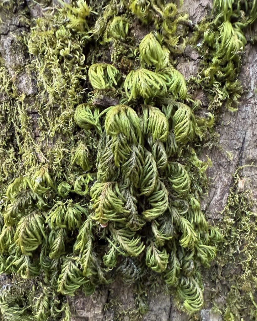 We’re used to lumping mosses and lichens together as those things that grow on trees, also known as epiphytes. Wikipedia tells us an epiphyte is a plant or plant-like organism that grows on another plant but is not parasitic. But wait, mosses are plants, but lichens are not and they’re only superficially plant-like. When mosses grow on rocks are they still epiphytes? Thanks to (full disclosure) ChatGPT we confirmed that both mosses and lichens can be epiphytes, but epiphytic is a lifestyle, not a thing. Mosses and lichens are epiphytic if they’re growing on a living plant. When they grow on rocks, they are epilithic. On logs, they’re epixylic.