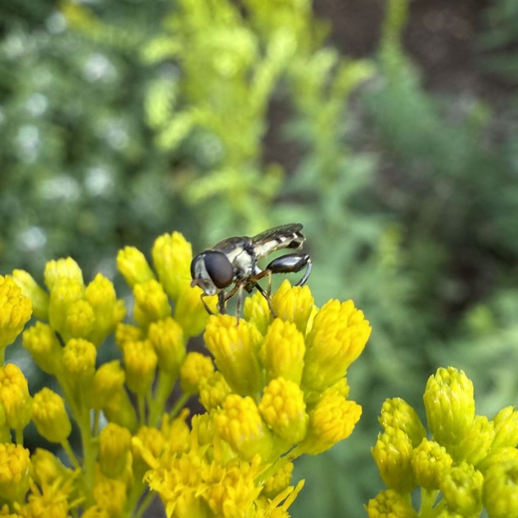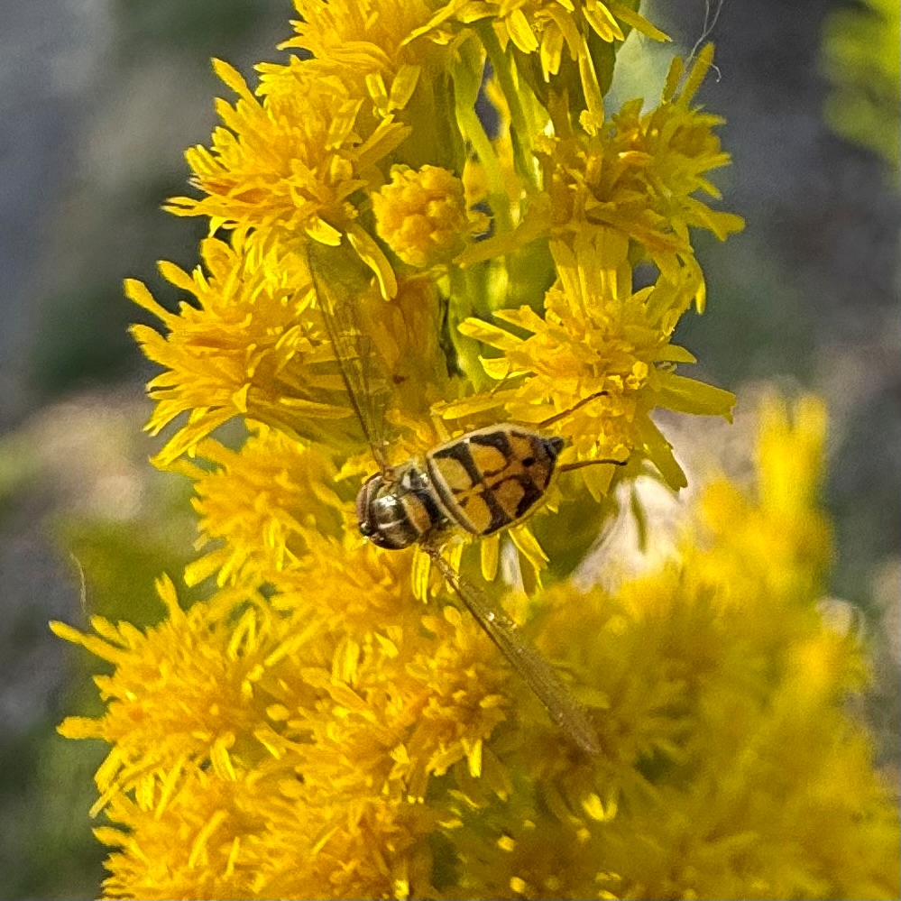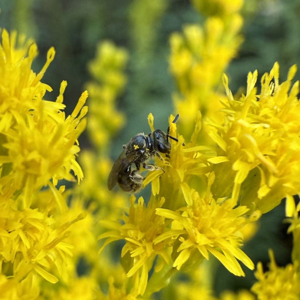 A walk along the Bluff this month will reveal that the pollinators are taking full advantage of what the Rose City Bluff Restoration community of growers and fall planters have done to increase the supply of native flowering plants. It is impossible to miss all the bumblebees visiting the California poppies, goldenrod, and other flowers. A close look at our goldenrod (Solidago) has given us an appreciation of the smaller pollinators as well. These tiny bees or flies are no more than 8mm long, but they are as beneficial as the big bumblebees. Here are three examples that we recently found on the goldenrod.
