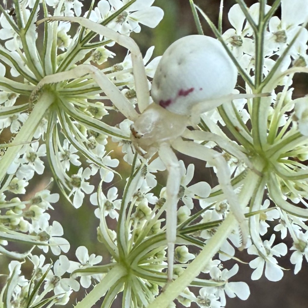 Our first example is Misumena vatia, commonly called the goldenrod crab spider. We spotted it on Queen Anne’s lace though it is a frequent visitor to goldenrod and milkweed. It’s called a crab spider for its unique ability to walk sideways. They also can change their color to blend with their surroundings. Hence, we saw a mostly white spider on the white flower.