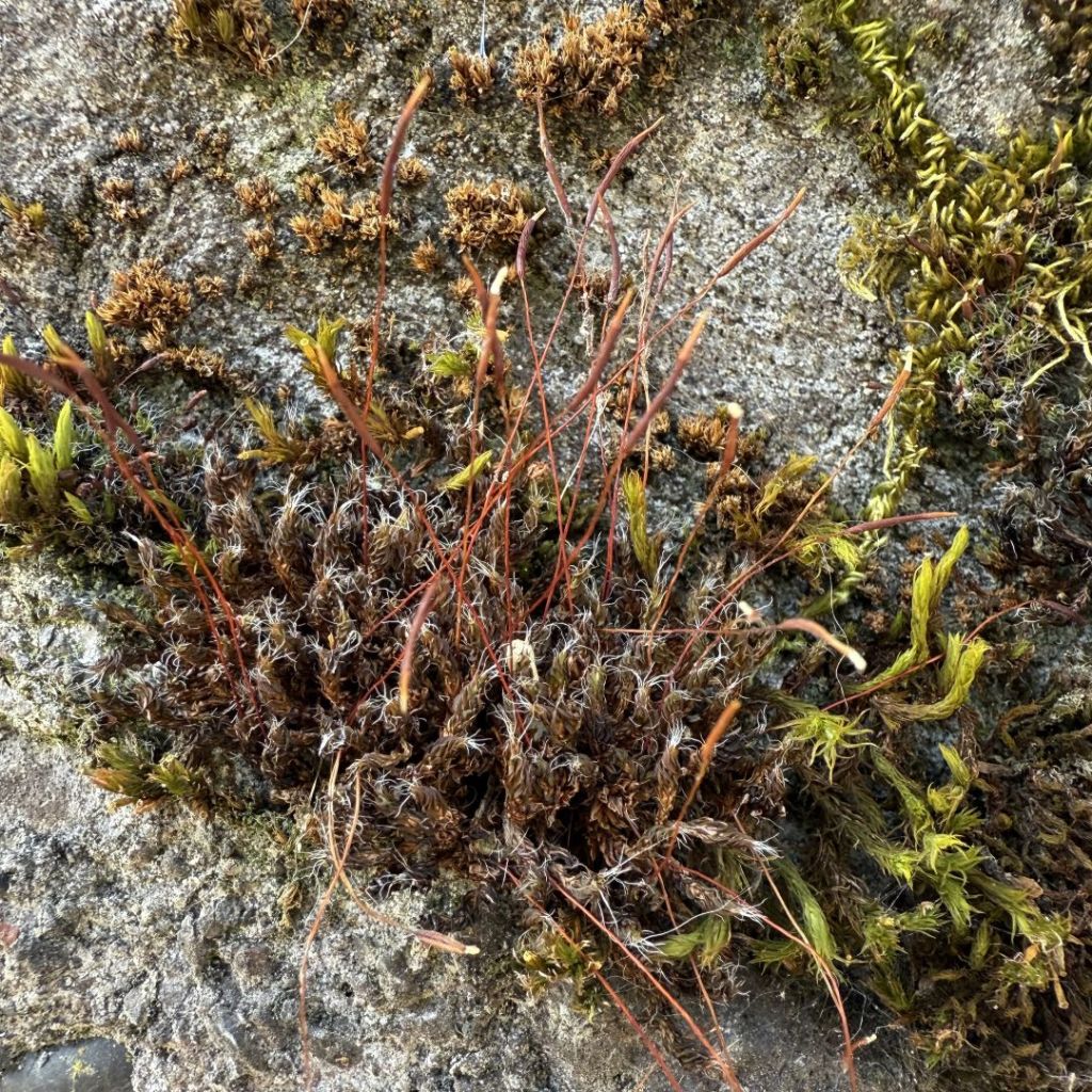One of the most interesting things about moss, other than being a primitive non-vascular and flowerless plant, is that in its primary form (the green stuff we usually see) the cells are haploid – they contain a single set of chromosomes. The life cycles of primitive plants like moss and fungi are predominantly haploid. In more recently evolved plants like flowers, the emphasis shifts to the diploid. In a moss, the diploid stage is the sporophyte, including the thin stalk-like structure (see photo). The sporophyte is short-lived but produces spores. When these spores germinate, they grow into leafy green moss, starting the cycle over again.