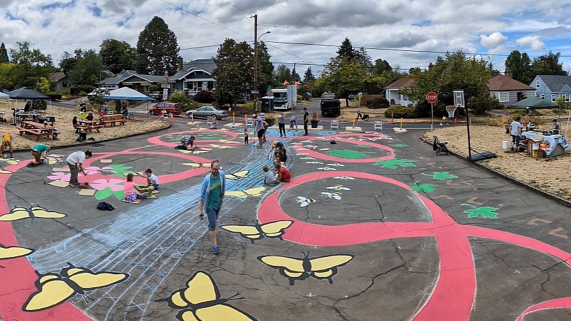 “The more successfully a city mingles everyday diversity of uses and users in its everyday streets, the more successfully, casually (and economically) its people thereby enliven and support well-located parks that can thus give back grace and delight to their neighborhoods instead of vacuity.” (Jane Jacobs, emphasis ours.) The Roseway Parkway Plaza, NE 72nd and Mason Street Plaza, once just an everyday street, is now a great place to facilitate civic engagement and community interaction.